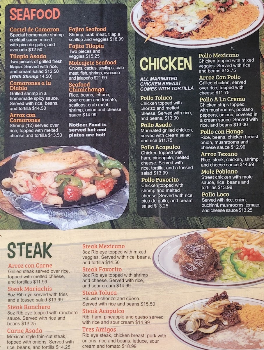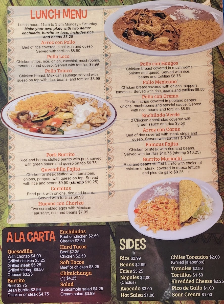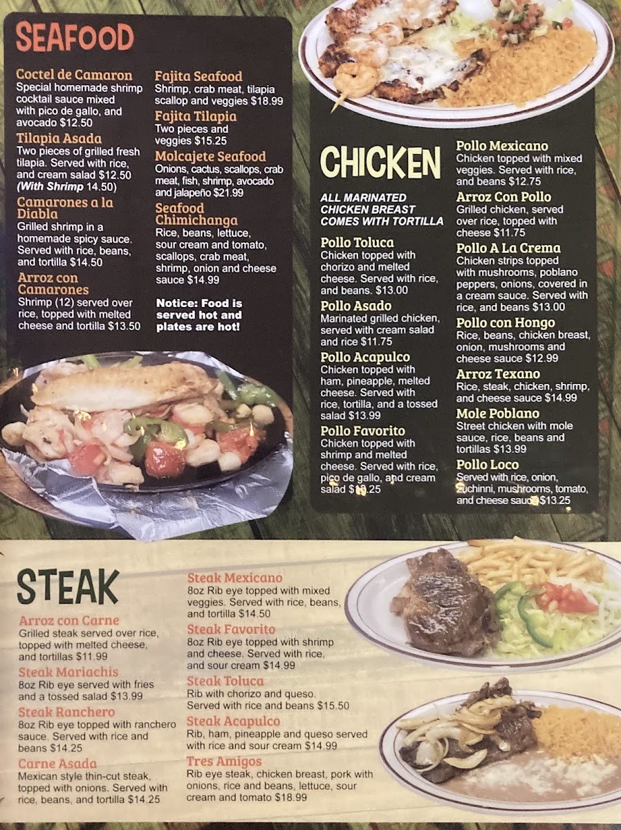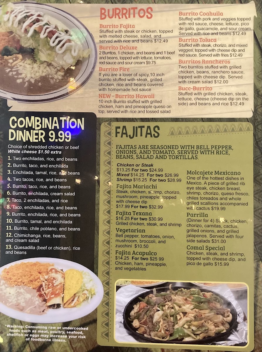 Guests can enjoy a variety of flavorful options like hearty burritos and combination dinners featuring tacos, enchiladas, and rice and beans. The menu also includes standout items such as the Pollo Toluca and Pizza Birria, which add a creative twist to traditional flavors. For sharing or a special meal for two, shrimp fajitas and nachos laden with toppings offer satisfying bites.