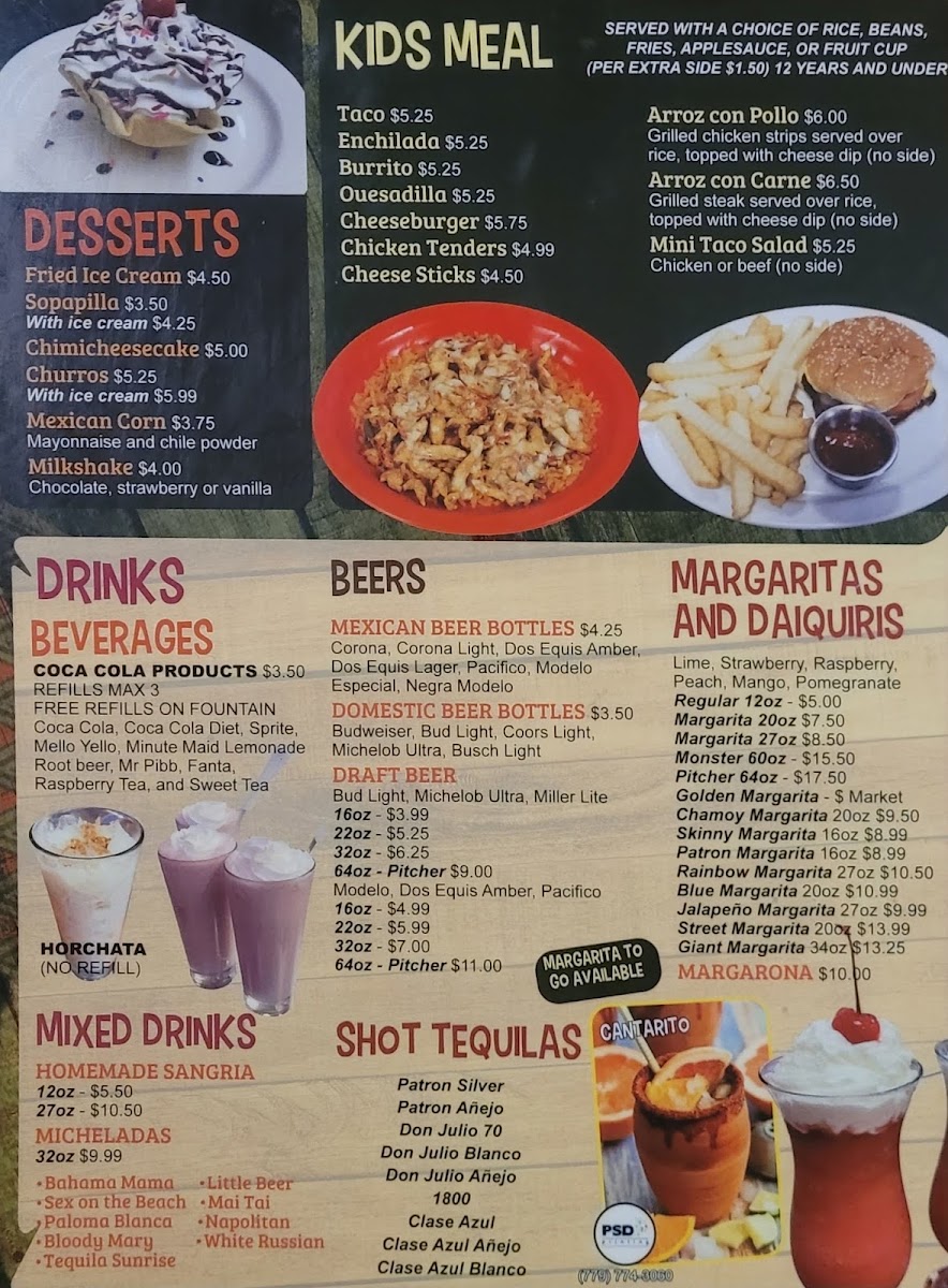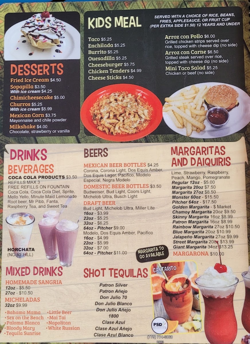 Complementing the savory dishes are refreshing beverages and desserts that round out the experience. From classic margaritas and sangrias to the distinctive pineapple-flavored items and the indulgent Helado Frito (fried ice cream), these selections capture the festive spirit of the menu without feeling too formal or complicated.
